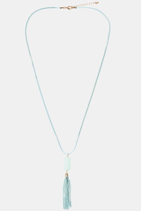 Kette. Lange Kette mit edlem Zierdekor und Metallic-Quast. Am feinen Band mit schimmerndem Gold-Effekt. Karabinerverschluss.