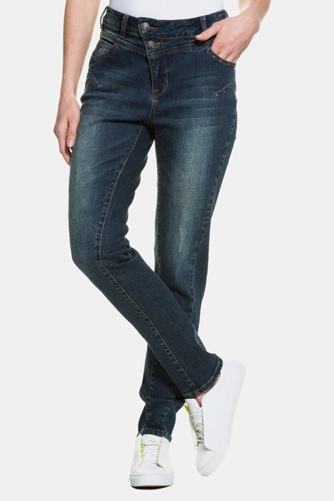 Boyfriendjeans Anna mit Wasch-Effekten, schönen Ziernieten an den Taschen und Destroy Effekten. 5-Pocket-Form, modische, asymmetrische Bundverarbeitung mit sichtbaren Knöpfen, kurzem Reißverschluss und Gürtelschlaufen. Bequemer Boyfriend Fit, normale Leibhöhe, schmal zulaufendes Bein.